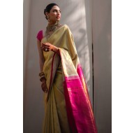 Dazzle like a star with our gold Kanjivaram saree, adored by actress Athiya Shetty for her Wedding Muhurtham ceremony. Embrace timeless beauty and make a statement with this resplendent and luxurious ensemble. This beauty is styled by celebrity stylist, Ms. Ami Patel.