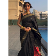 Get hold of this gorgeous black and gold traditional handloom Paithani saree, which was also loved by the actress Bhumi Pednekar for Makar Sankranti. She was styled by stylist Tanya Ghavri, who paired the weave with Maharashtrian nathani and chandrakor bindi.