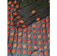 An exemplary Silk Saree has been immensely crafted ?skillfully to become an epitome of elegance for the women who would love to keep their dressing styles in culture and tradition This Saree is a mixture of Tussar Silk with the shimmery Zari and Aari Embroidery of Kashmir The dark Colour Silk base plays home to two simultaneous borde complimenting each other being the two age old crafts of thread work of the Valley Drape this traditional symbol of epitome, style and art and let everyone get hanged when you walk around wearing this masterpiece