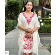 This Creme Base Pink Floral Design Embroidered Short Kaftan is a stylish and elegant addition to any wardrobe. Made from a soft and comfortable creme base fabric, this kaftan features a beautiful pink floral design that is delicately embroidered onto the fabric. The short length adds a modern touch to the traditional kaftan style, making it perfect for both casual and formal occasions. With its loose and flowy fit, this kaftan offers a comfortable and flattering silhouette for all body types. Whether worn as a beach cover-up or paired with leggings for a chic bohemian look, this kaftan is a versatile and fashionable choice.