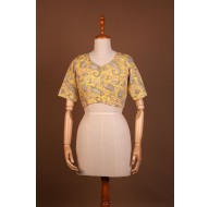 The Sunflower Cotton Blouse features yellow Jaipuri cotton with a charming floral print. Its simple cut and back keyhole detail offer comfort and style. Perfect for summer, it effortlessly combines elegance and ease, making it ideal for any casual occasion.