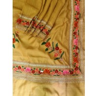 An exemplary Silk Saree has been immensely crafted ?skillfully to become an epitome of elegance for the women who would love to keep their dressing styles in culture and tradition This Saree is a mixture of Tussar Silk with the shimmery Zari and Aari Embroidery of Kashmir The dark Colour Silk base plays home to two simultaneous borde complimenting each other being the two age old crafts of thread work of the Valley Drape this traditional symbol of epitome, style and art and let everyone get hanged when you walk around wearing this masterpiece