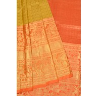 The saree is apt for the bridal look. The whole saree is weaved in rudraksh motifs in self design on the golden part. The heavy borders of the saree are weaved intricately in bel pattern.