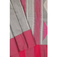 Madhurya presents this stunning grey Jamdani handloom cotton saree with a delicate dusty pink border. The saree features elegant white vertical lines, while the grand pallu showcases white horizontal lines and intricate patterns woven with pink and white threads. Finished with pink and white tassels, this saree is highly breathable and effortlessly stylish.