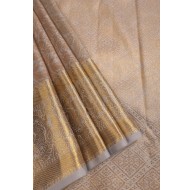 Madhurya presents a greyish-light blue Kanjivaram pure silk saree with a broad gold zari border featuring peacock motifs. The saree showcases an elaborate vanasingharam jaal pattern with gold zari, including horses and floral designs. The grand, intricately patterned pallu adds a touch of elegance, making it ideal for any auspicious occasion.
