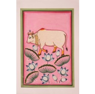 Madhurya presents a stunning hand-painted Pichwai featuring the sacred Dhenu (cow), symbolizing purity and devotion to Lord Shrinathji. Crafted on cloth, this vibrant artwork also features lotuses, representing spiritual enlightenment. The intricate details in the Pichwai bring together the essence of divine protection and the serene beauty of nature.