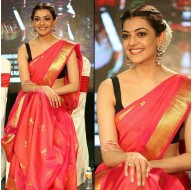 Experience the grace and elegance of this pink handloom Kanjivaram silk saree. Adorned with adorable bunny motifs, as donned by the stunning Kajal Agarwal, it not only adds a playful and enchanting touch but also drapes gracefully, enhancing your overall look. This is a Madhurya original creation called “My First Saree”.The delivery timeline for this gorgeous saree is 8-16 weeks.Graceful Pink Elegance: This handloom Kanjivaram silk saree in a lovely pink shade exudes grace and elegance, enhancing your natural beauty.