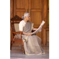 Madhurya presents this light khaki Jamdani handloom saree is a beautiful blend of elegance and comfort. Lightweight and breathable, it features a golden zari border with a white patti. The pallu showcases intricate floral patterns with tassels, while tones of green and grey add a unique charm to its look.