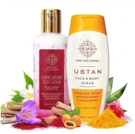 Kumkumadi Body Lotion & Ubtan Scrub combo. Elevate your self-care routine to new heights with this luxurious pairing that will leave your skin feeling nourished, rejuvenated, and glowing from head to toe.