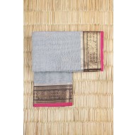 Introducing our elegant Light Grey Chettinad Cotton Saree, featuring a classic black border adorned with exquisite golden thread work and intricate peacock motifs. The soft, neutral grey body is beautifully contrasted by a vibrant pink salvage running along the edge, adding a subtle pop of colour. This graceful saree blends traditional artistry with a modern palette, perfect for making a refined statement at any occasion.
