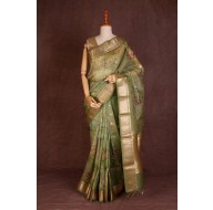 Gold Zari Motifs: Scattered throughout the saree, exquisite gold zari motifs add a layer of elegance and sparkle, enhancing the natural theme.