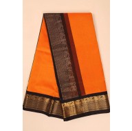 Madhurya presents this orange handwoven silk cotton Kanchipuram saree features a striking contrast with a black border and pallu. Adorned with gold zari paisley motifs and fine checks, it’s an eye-catching piece. Easy to wear and drape, this saree offers a classy and dressy look, perfect for making a statement.