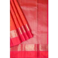 Madhurya presents an exquisite orange-pink Kanjivaram saree, intricately designed with orange Resham thread, creating a beautiful dual-tone effect. The bright red border, in self-weave with gold zari and elegant peacock motifs, adds to its charm. The pallu is gorgeous and heavy, richly woven with gold zari, making this saree a true masterpiece.