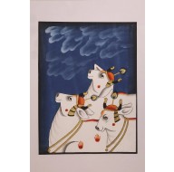 Madhurya offers a beautiful hand-painted Pichwai showcasing a herd of cows, embodying devotion to Lord Shrinathji. This vibrant artwork, painted on cloth, symbolizes the purity and abundance represented by the cows, and the divine harmony of Pichwai art, bringing peace and blessings into your space.