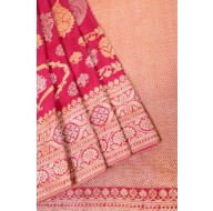 Madhurya presents a stunning pink floral Banarasi saree, adorned with intricate gold and silver zari work. The saree features beautiful floral and paisley motifs woven throughout, while the broad border and pallu are richly crafted with elegant golden zari in a detailed, luxurious pattern, perfect for special occasions.