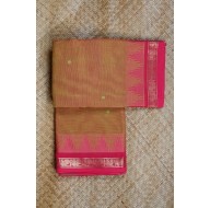 This beautiful green Chettinad cotton saree features a pink border woven with golden zari and is adorned with small buttis throughout. The saree has a lovely dual-tone effect of pink and green, making it perfect for any occasion. Enjoy both elegance and comfort with this stylish saree.