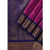 Introducing our Pink Kanchipuram Pure Silk Saree! This saree features a blue broad border and pallu, beautifully woven with traditional gold zari patterns. Small peacock buttis in gold zari are spread throughout, adding charm. Perfect for any special occasion, this saree combines elegance and tradition effortlessly.