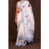 Discover our White Handloom Linen Saree, adorned with a delicate floral print and a charming blue border, complemented by tassels at the end of the pallu. Crafted from soft and breathable fabric, this saree drapes like a dream, perfect for any occasion. Embrace elegance and comfort with this exquisite saree.
