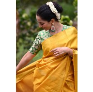 Madhurya presents a stunning yellow Kanchipuram saree, adorned with gold zari peacock motifs and a touch of green Resham thread, giving it a unique and vibrant look. The border and pallu are weaved in traditional gold zari patterns, blending traditional elegance with contemporary charm for a timeless appeal.